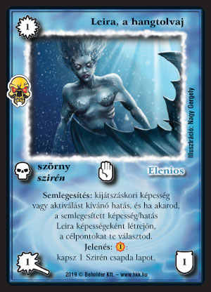 Kiadás: Élőholt invázió Gyakoriság: ritka Lapszín (isten): Elenios Típus: szörny Altípus: szirén Szöveg: Semlegesítés: kijátszáskori képesség vagy aktiválást kívánó hatás, és ha akarod, a semlegesített képesség/hatás Leira képességeként létrejön, a célpontokat te választod. Jelenés: (1): kapsz 1 Szirén csapda lapot. Illusztráció: Nagy Gergely