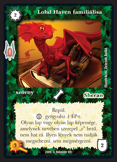 Szöveg: Repül. 1_VP: gyógyulsz 1 ÉP-t. Olyan lap vagy olyan lap képessége, amelynek nevében szerepel "r" betű, nem hat rá. Ilyen lények nem tudják megsebezni, sem megmérgezni.