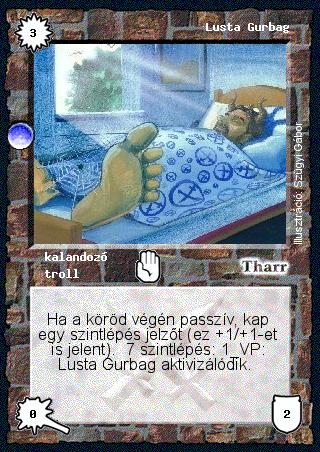 Kiadás: Árnyékhold, Túlélők Földje Gyakoriság: nem gyakori Lapszín (isten): Tharr Típus: kalandozó Altípus: troll Szöveg: Ha a köröd végén passzív, kap egy szintlépés jelzőt (ez +1/+1-et is jelent). 7 szintlépés: 1 VP: Lusta Gurbag aktivizálódik. Illusztráció: