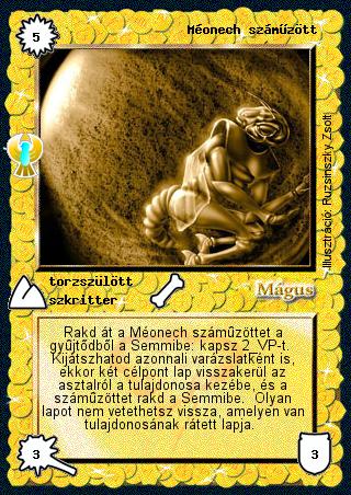 Kiadás: Ébredés Gyakoriság: ritka Lapszín (isten): Mágus Klán Típus: torzszülött Altípus: szkritter Szöveg: Rakd át a Méonech száműzöttet a gyűjtődből a Semmibe: kapsz 2 VP-t. Kijátszhatod azonnali varázslatként is, ekkor két célpont lap visszakerül az asztalról a tulajdonosa kezébe, és a száműzöttet rakd a Semmibe. Olyan lapot nem vetethetsz vissza, amelyen van tulajdonosának rátett lapja. Illusztráció: Ruzsinszki Zsolt