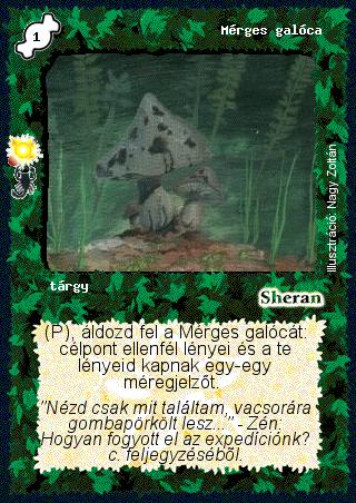 Kiadás: Skorpió (Csillagképek) Gyakoriság: ritka Lapszín (isten): Sheran Típus: tárgy Szöveg: (P), áldozd fel a Mérges galócát: célpont ellenfél lényei és a te lényeid kapnak egy-egy méregjelzőt. Szinesítő szöveg: "Nézd csak mit találtam, vacsorára gombapörkölt lesz..." - Zén: Hogyan fogyott el az expedíciónk? c. feljegyzéséből. Illusztráció: Nagy Zoltán