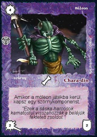 Kiadás: Isteni szövetség Gyakoriság: gyakori Lapszín (isten): Chara-din Típus: szörny Szöveg: Amikor a móleon játékba kerül, kapsz egy szörnykomponenst. Szinesítő szöveg: "Ezek a sáska-harcosok kamatostul visszahozzák a beléjük fektetett zsoldot." Illusztráció: Szász Gábor