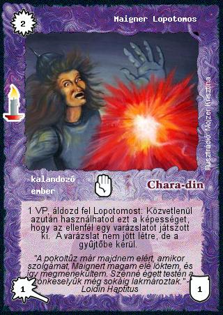 Kiadás: Múltidéző, Alappakli, 8. kiadás Gyakoriság: nem gyakori Lapszín (isten): Chara-din Típus: kalandozó Altípus: ember Szöveg: 1 VP, áldozd fel Lopotomost: Közvetlenül azután használhatod ezt a képességet, hogy az ellenfél egy varázslatot játszott ki. A varázslat nem jött létre, de a gyűjtőbe kerül. Szinesítő szöveg: "A pokoltűz már majdnem elért, amikor szolgámat, Maignert magam elé löktem, és így megmenekültem. Szénné égett testén a drónkeselyűk még sokáig lakmároztak." - Loidin Haptitus Illusztráció: Mojzer Krisztina