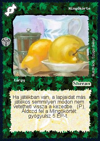 Kiadás: Isteni szövetség Gyakoriság: gyakori Lapszín (isten): Sheran Típus: tárgy Szöveg: Ha játékban van, a lapjaidat más játékos semmilyen módon nem vetetheti vissza a kezedbe. (P), Áldozd fel a Mingókörtét: gyógyulsz 5 ÉP-t. Illusztráció: