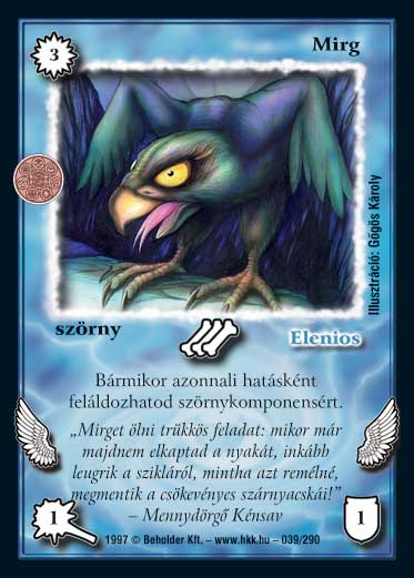 Kiadás: Létsíkok, Túlélők Földje Gyakoriság: gyakori Lapszín (isten): Elenios Típus: szörny Szöveg: Repül. Bármikor azonnali hatásként feláldozhatod szörnykomponensért. Szinesítő szöveg: "Mirget ölni trükkös feladat: mikor már majdnem elkaptad a nyakát, inkább leugrik a szikláról, mintha azt remélné, megmentik a csökevényes szárnyacskái!" - Mennydörgő Kénsav Illusztráció: Gőgös Károly