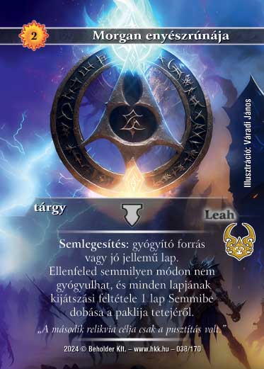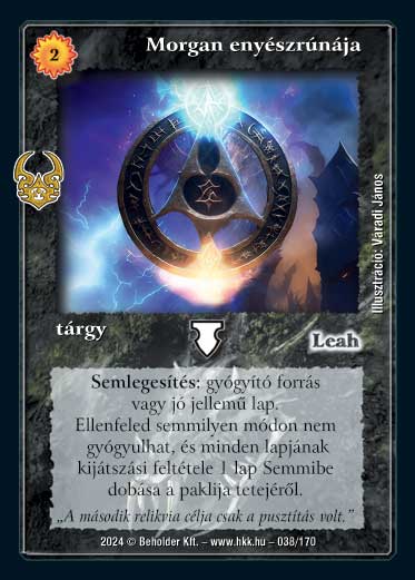 Kiadás: Ősi Káosz Gyakoriság: ritka Lapszín (isten): Leah Típus: tárgy Szöveg: Semlegesítés: gyógyító forrás,vagy jó jellemű lap. Ellenfeled semmilyen módon nem gyógyulhat, és minden lapjának kijátszási feltétele 1 lap Semmibe dobása a paklija tetejéről. Szinesítő szöveg: "A második relikvia célja csak az enyészet és pusztulás volt." Illusztráció: Váradi János