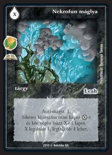 Kiadás: Varázstárgyak (Zén) Gyakoriság: ritka Lapszín (isten): Leah Típus: tárgy Altípus: - Szöveg: Anti-mágia: 1. Sikeres kijátszása után kapsz X_VP-t és kör végén húzz X+1 lapot. X legalább 1, legfeljebb 4 lehet. Illusztráció: Baranya Tamás