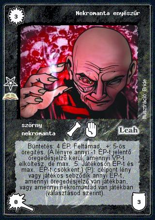 Szöveg: Büntetés: 4 ÉP. Feltámad. +: 5-ös öregítés. (A lényre annyi -1 ÉP-t jelentő öregedésjelző kerül, amennyi VP-t elköltesz, de max. 5. Játékoson ÉP-t és max. ÉP-t csökkent.) (P): célpont lény vagy játékos sebződik annyi ÉP-t, amennyi öregedésjelző van játékban, vagy amennyi nekromantád van játékban (választásod szerint).
