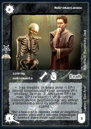 Kiadás: Nekromanta szentély (Zén) Gyakoriság: ritka Lapszín (isten): Leah Típus: szörny Altípus: nekromanta Szöveg: +: 3-as öregítés. (A lényre annyi -1 ÉP-t jelentő öregedésjelző kerül, amennyi VP-t elköltesz, de max. 3. Játékoson ÉP-t és max. ÉP-t csökkent.) 1 VP, áldozd fel: Célpont játékos gyűjtőjéből egy lény aktívan a tartalékodba kerül és ezentúl élőholtnak számít. Szinesítő szöveg: "Már a tanoncok is képesek voltak az öregítésre és amikor áldozatuk a rohamos öregedésbe belehalt, életre hívták saját oldalukon." Illusztráció: Ruzsinszki Zsolt Tervező: Éles Áron