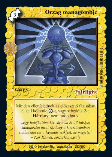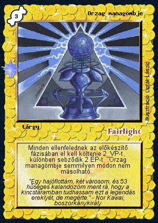 Kiadás: Ezüsthajnal, Túlélők Földje Gyakoriság: ritka Lapszín (isten): Fairlight Típus: tárgy Szöveg: Minden ellenfelednek az előkészítő fázisában el kell költenie 2 VP-t, különben sebződik 2 ÉP-t. Orzag managömbje semmilyen módon nem másolható. Szinesítő szöveg: "Egy hajóflottám, két városom, és 53 hűséges kalandozóm ment rá, hogy a kincstáramban tudhassam ezt a legendás ereklyét, de megérte." - Nor Kawai, boszorkánykirály Illusztráció: Lipták László