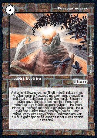 Kiadás: Alappakli, 3. kiadás, Alappakli, 4. kiadás Gyakoriság: gyakori Lapszín (isten): Tharr Típus: bűbáj bűbájra Szöveg: Akkor is kijátszhatod, ha Tiltott mágiát raktak ki rá. A bűbáj, amin a Poszogó möszék van, a gazdája előkészítő fázisában a gyűjtőbe kerül. Ezután a bűbáj gazdájának át kell raknia a Poszogó möszéket egy másik, célpont bűbájra. Ha ilyen nincs, a Poszogó möszék a gyűjtőbe kerül. Ha a gyűjtőbe küldött bűbáj Szörnybűvölés, Tiltott mágia, vagy ezek egyikének Bűbájmásolata volt, akkor a gazdájának az összes lapot el kell dobnia a kezéből. Illusztráció: Nagy Zoltán