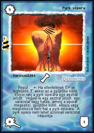 Kiadás: Rúvel hegy Gyakoriság: ritka Lapszín (isten): Pszionicista Klán Típus: torzszülött Szöveg: Repül. +: Ha ellenfelének ÉP-je legfeljebb 3, akkor az a gyűjtőbe kerül. Ekkor rakj a pyrk viperára egy asztrál jelzőt. Vegyél le egy asztrál jelzőt: egy varázslat vagy hatás, amely a viperát megsebzi, gyűjtőbe küldi, ellopja vagy megcélozza nem hat a pyrk viperára. A pyrk vipera nem lehet azonnali varázslat célpontja. Illusztráció: Váradi János