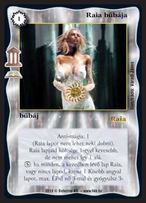 Szöveg: Anti-mágia: 1 (Raia lapot nem lehet neki dobni). Raia lapjaid költsége 1-gyel kevesebb, de nem mehet így 1 alá. (S): ha minden, a kezedben lévő lap Raia, vagy nincs lapod, kapsz 1 Kisebb angyal lapot, max. ÉP-d nő 3-mal és gyógyulsz 3-at.