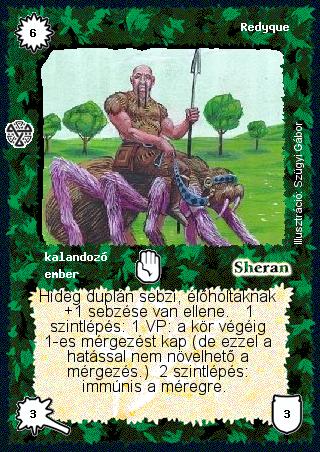 Kiadás: Isteni szövetség Gyakoriság: ritka Lapszín (isten): Sheran Típus: kalandozó Altípus: ember Szöveg: Hideg duplán sebzi, élőholtaknak +1 sebzése van ellene. 1 szintlépés: 1 VP: a kör végéig 1-es mérgezést kap (de ezzel a hatással nem növelhető a mérgezés.) 2 szintlépés: immúnis a méregre. Illusztráció: