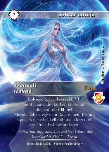 Kiadás: Víziók, Védnök 2023 Gyakoriság: ritka Lapszín (isten): Raia Típus: azonnali Altípus: reakció Szöveg: Alap idézési költsége eggyel kevesebb VP, mint ahányadik körben kijátszod, de nem több 5 VP-nél. Közvetlenül azután játszhatod ki, hogy ellenfeled megpróbált kijátszani egy nem Raia és nem Elenios lapot. Ez a lap nem jön létre, csak a gyűjtőbe kerül, és neked el kell dobnod a kezedből egy általad választott lapot. Szinesítő szöveg: "Solisarnak megvannak az eszközei Chara-din káoszhordái ellen." - Treem Illusztráció: Váradi János
