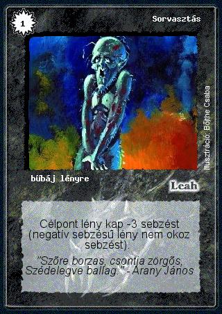 Kiadás: Alappakli, 1. kiadás, Alappakli, 2. kiadás, Alappakli, 3. kiadás, Alappakli, 4. kiadás Gyakoriság: gyakori Lapszín (isten): Leah Típus: bűbáj lényre Szöveg: Célpont lény kap -3 sebzést (negatív sebzésű lény nem okoz sebzést). Szinesítő szöveg: "Szőre borzas, csontja zörgős, Szédelegve ballag." - Arany János Illusztráció: Bőjthe Csaba