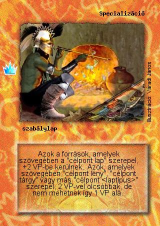 Kiadás: Ősi legendák Gyakoriság: nem gyakori Lapszín (isten): Nincs Típus: szabálylap Szöveg: Azok a források, amelyek szövegében a "célpont lap" szerepel, +2 VP-be kerülnek. Azok, amelyek szövegében "célpont lény", "célpont tárgy" vagy más "célpont " szerepel, 2 VP-vel olcsóbbak, de nem mehetnek így 1 VP alá. Illusztráció: Váradi János