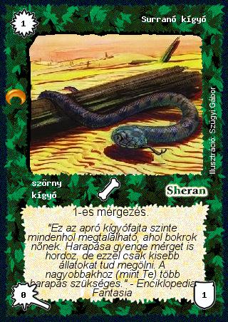 Kiadás: Chara-din visszatér Gyakoriság: gyakori Lapszín (isten): Sheran Típus: szörny Altípus: kígyó Szöveg: 1-es mérgezés. Szinesítő szöveg: "Ez az apró kígyófajta szinte mindenhol megtalálható, ahol bokrok nőnek. Harapása gyenge mérget is hordoz, de ezzel csak kisebb állatokat tud megölni. A nagyobbakhoz (mint Te) több harapás szükséges." - Enciklopedia Fantasia Illusztráció: