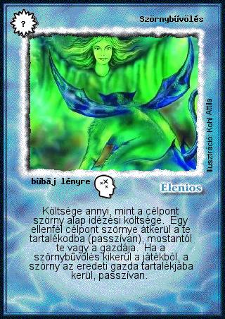 Kiadás: Alappakli, 1. kiadás, Alappakli, 3. kiadás, Alappakli, 4. kiadás, Védnök 2021, Túlélők Földje Gyakoriság: ritka Lapszín (isten): Elenios Típus: bűbáj lényre Szöveg: Költsége annyi, mint a célpont szörny alap idézési költsége. Egy ellenfél célpont szörnye átkerül a te tartalékodba (passzívan), mostantól te vagy a gazdája. Ha a szörnybűvölés kikerül a játékból, a szörny az eredeti gazda tartalékjába kerül, passzívan. Illusztráció: Kohl Attila