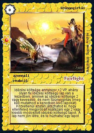 Kiadás: Rhatt fénykora, Alappakli, 8. kiadás Gyakoriság: ritka Lapszín (isten): Fairlight Típus: azonnali Altípus: reakció Szöveg: Idézési költsége annyiszor +2 VP, ahány olyan fix idézési költségű lap van a kezedben, aminek az idézési költsége 2 vagy kevesebb, és nem Szúnyogirtás (meg kell mutatnod a kezedben levő lapokat). Közvetlenül azután játszhatod ki, hogy ellenfeled megpróbált kijátszani egy 2 vagy kisebb módosított idézési költségű lapot. A lap nem jön létre, és te húzhatsz egy lapot. Illusztráció: Szeiner András
