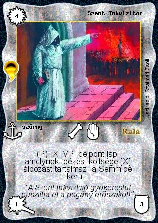 Kiadás: Aranyforrás Gyakoriság: gyakori Lapszín (isten): Raia Típus: szörny Szöveg: (P), X VP: célpont lap, amelynek idézési költsége [X] áldozást tartalmaz, a Semmibe kerül. Szinesítő szöveg: "A Szent Inkvizíció gyökerestül pusztítja el a pogány erőszakot!" Illusztráció: Szatmári Zsolt