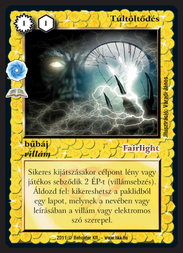 Kiadás: Őselemi káosz (Zén) Gyakoriság: ritka Lapszín (isten): Fairlight Típus: bűbáj Altípus: villám Szöveg: Sikeres kijátszásakor célpont lény vagy játékos sebz?dik 2 ÉP-t (villámsebzés). Áldozd fel: kikereshetsz a paklidból egy lapot, melynek a nevében vagy leírásában a villám vagy elektromos szó szerepel. Illusztráció: Váradi János