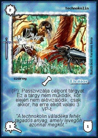 Kiadás: Hőskorszak Gyakoriság: gyakori Lapszín (isten): Elenios Típus: szörny Szöveg: (P): Passzivizálja célpont tárgyat. Ez a tárgy nem működik, kör elején nem aktivizálódik, csak akkor, ha erre elkölt valaki 3 VP-t. Szinesítő szöveg: "A technokolin váladéka fehér, ragadós anyag, amely levegőn azonnal megköt." Illusztráció: Kerekes Ilona