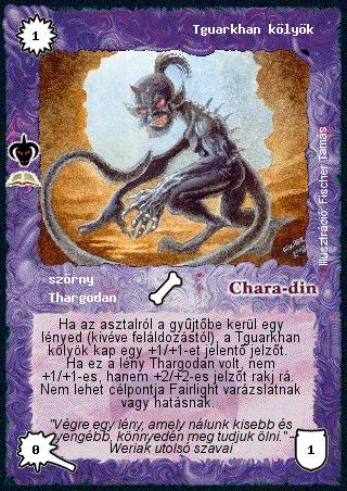 Kiadás: Thargodanok földje (Zén) Gyakoriság: ritka Lapszín (isten): Chara-din Típus: szörny Altípus: Thargodan Szöveg: Ha az asztalról a gyűjtőbe kerül egy lényed (kivéve feláldozástól), a Tguarkhan kölyök kap egy +1/+1-et jelentő jelzőt. Ha ez a lény Thargodan volt, nem +1/+1-es, hanem +2/+2-es jelzőt rakj rá. Nem lehet célpontja Fairlight varázslatnak vagy hatásnak. Szinesítő szöveg: "Végre egy lény, amely nálunk kisebb és gyengébb, könnyedén meg tudjuk ölni." - Weriak utolsó szavai Illusztráció: Fischer Tamás