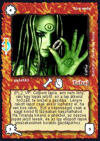 Kiadás: Sötét kor Gyakoriság: ritka Lapszín (isten): Tolvaj Klán Típus: galetki Szöveg: (P),2 VP: Célpont lapra, ami nem lény, rakj egy lopás jelzőt, ez a lap átkerül hozzád, te leszel a gazdája. Lényre rakott lapot csak akkor lophatsz el, ha van kire rakni. Ezt a képességet csak a saját köröd fő fázisában használhatod. Ha Tirranda kikerül a játékból, az összes lopás jelző leesik, és az így ellopott lapok visszakerülnek korábbi gazdájukhoz. Illusztráció: Havancsák Gyula