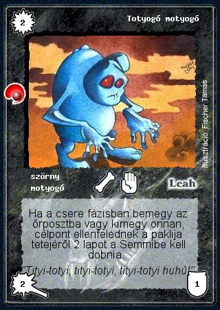 | (AK68) A csere fázis nem úgy működik, hogy az asztalon tologatom ide-oda a lényeket, ahányszor akarom, hanem megnézem, hogy a fázis elején melyik lény hol volt, és megnézem, hogy a fázis végén hol lesznek a lények. Amelyik lény helyzete változott, az mozgott a cserefázisban. A Totyogó motyogó tehát akkor dobat az ellenfél paklijából, ha a csere fázis elejéhez képest a fázis végére változott a helyzete őrposzt-tartalék szempontból. |