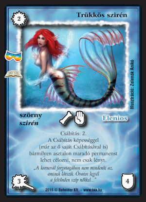 Kiadás: Karnevál (Zén) Gyakoriság: ritka Lapszín (isten): Elenios Típus: szörny Altípus: szirén Szöveg: Csábítás: 2. A Csábítás képességgel (már az ő saját Csábításával is) nem csak lényt, hanem más, asztalon maradó permanenst is lehet célozni. Szinesítő szöveg: "A Karnevál forgatagában nem mindenki az, aminek látszik. Óvatos legyél a feltűnően szép nőkkel...." Illusztráció: Zelenák Anikó
