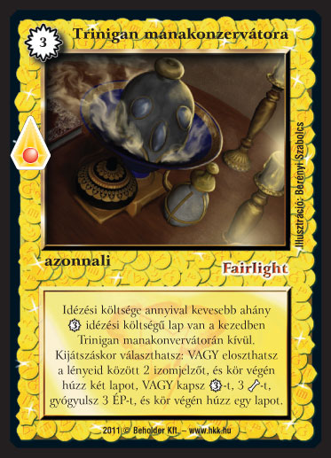 Kiadás: Zanszilánkok Gyakoriság: ritka Lapszín (isten): Fairlight Típus: azonnali Altípus: - Szöveg: Idézési költsége annyival kevesebb ahány 3_VP idézési költségű lap van a kezedben Trinigan manakonvervátorán kívül. Kijátszáskor választhatsz: VAGY eloszthatsz a lényeid között 2 izomjelzőt, és kör végén húzz két lapot, VAGY kapsz 3_VP-t, 3 _*-t, gyógyulsz 3 ÉP-t, és kör végén húzz egy lapot. Illusztráció: Berényi Szabolcs
