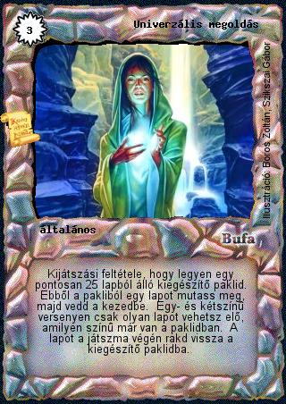 Kiadás: Káoszkatlan Gyakoriság: ultra ritka Lapszín (isten): Bufa Típus: általános Szöveg: Kijátszási feltétele, hogy legyen egy pontosan 25 lapból álló kiegészítő paklid. Ebből a pakliból egy lapot mutass meg, majd vedd a kezedbe. Egy- és kétszínű versenyen csak olyan lapot vehetsz elő, amilyen színű már van a paklidban. A lapot a játszma végén rakd vissza a kiegészítő paklidba. Illusztráció: Boros Zoltán, Szikszai Gábor