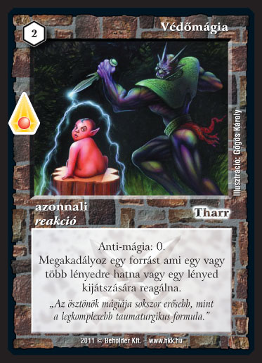 Kiadás: Zanszilánkok Gyakoriság: ritka Lapszín (isten): Tharr Típus: azonnali Altípus: reakció Szöveg: Anti-mágia: 0. Megakadályoz egy forrást ami egy vagy több lényedre hatna vagy egy lényed kijátszására reagálna. Szinesítő szöveg: "Az ösztönök mágiája sokszor erősebb, mint a legkomplexebb taumaturgikus formula." Illusztráció: Gőgös Károly