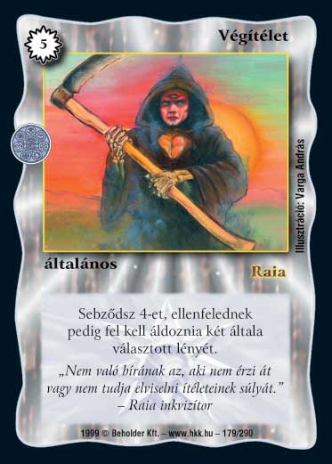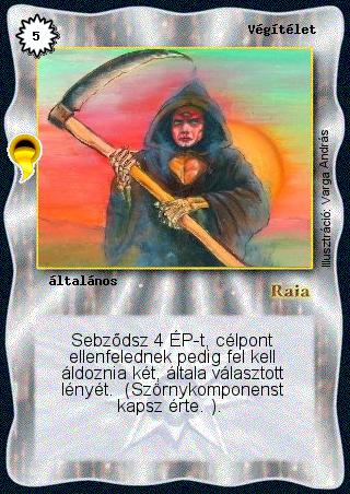Kiadás: Aranyforrás, Túlélők Földje Gyakoriság: nem gyakori Lapszín (isten): Raia Típus: általános Szöveg: Sebződsz 4 ÉP-t, célpont ellenfelednek pedig fel kell áldoznia két, általa választott lényét. (Szörnykomponenst kapsz érte. ). Illusztráció: Varga András
