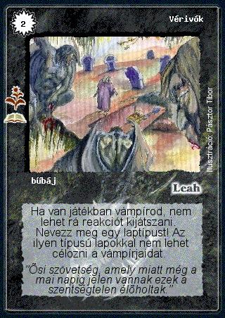 Kiadás: Holtláp (Zén) Gyakoriság: ritka Lapszín (isten): Leah Típus: bűbáj Szöveg: Ha van játékban vámpírod, nem lehet rá reakciót kijátszani. Nevezz meg egy laptípust! Az ilyen típusú lapokkal nem lehet célozni a vámpírjaidat. Szinesítő szöveg: "Ősi szövetség, amely miatt még a mai napig jelen vannak ezek a szentségtelen élőholtak." Illusztráció: Pásztor Tibor