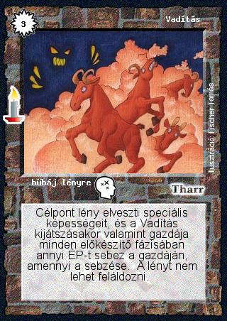 Kiadás: Múltidéző, Alappakli, 8. kiadás Gyakoriság: nem gyakori Lapszín (isten): Tharr Típus: bűbáj lényre Szöveg: Célpont lény elveszti speciális képességeit, és a Vadítás kijátszásakor valamint gazdája minden előkészítő fázisában annyi ÉP-t sebez a gazdáján, amennyi a sebzése. A lényt nem lehet feláldozni. Illusztráció: Fischer Tamás