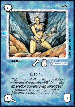 Kiadás: Ősi legendák Gyakoriság: gyakori Lapszín (isten): Pszionicista Klán Típus: galetki Szöveg: Élet: 1. Szinesítő szöveg: "Néhány galetki a Hegymélybe menekül a sorozás elől. Ott aztán az élettől ugyanolyan kiképzést kapnak, mint amilyennel a Mesterek akarták ellátni őket." Illusztráció: Gősi Adrienne