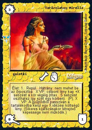 Kiadás: Káoszkatlan Gyakoriság: ritka Lapszín (isten): Mágus Klán Típus: galetki Szöveg: Élet: 1. Repül. Hátrány: nem mehet be az őrposztba. X VP: célpont lény kap +X sebzést a kör végéig (max. 5 sebzést oszthatsz így szét egy körben). (P), X VP: A gyűjtődből passzívan a tartalékodba kerül egy X idézési költségű lény. (Sikeres kijátszásakor létrejövő képessége nem működik.) Illusztráció: Boros Zoltán, Szikszai Gábor