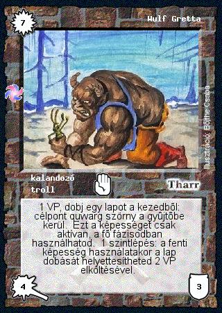 Kiadás: Létsíkok Gyakoriság: ritka Lapszín (isten): Tharr Típus: kalandozó Altípus: troll Szöveg: 1 VP, dobj egy lapot a kezedből: célpont quwarg szörny a gyűjtőbe kerül. Ezt a képességet csak aktívan, a fő fázisodban használhatod. 1 szintlépés: a fenti képesség használatakor a lap dobását helyettesítheted 2 VP elköltésével. Illusztráció: Bőjthe Csaba