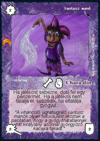 Szinesítő szöveg: "A viháncoló, ugrabugráló xantusz manók olyan felfordulást okoztak a palotában, hogy a gyógyíthatatlannak hitt királylány azonnal gyöngyöző kacajra fakadt."