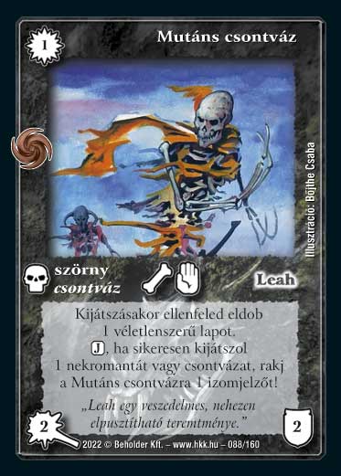 Szöveg: Kijátszásakor ellenfeled eldob 1 véletlenszerű lapot. (J), ha sikeresen kijátszol 1 nekromantát vagy csontvázat, rakj a Mutáns csontvázra 1 izomjelzőt!