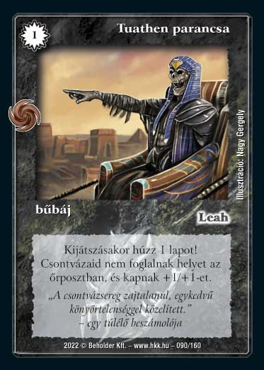 Kiadás: Résföld Gyakoriság: gyakori Lapszín (isten): Leah Típus: bűbáj Altípus: - Szöveg: Kijátszásakor húzz 1 lapot! Csontvázaid nem foglalnak helyet az őrposztban, és kapnak +1/+1-et. Szinesítő szöveg: "A csontvázsereg zajtalanul, egykedvű könyörtelenséggel közelített." - egy túlélő beszámolója Illusztráció: Nagy Gergely