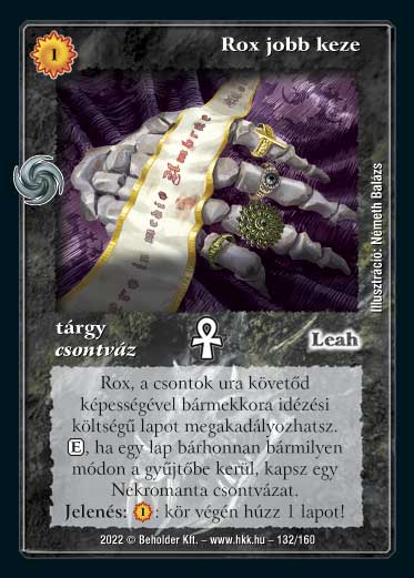 Szöveg: Rox, a csontok ura követőd képességével bármekkora idézési költségű lapot megakadályozhatsz. (E), ha egy lap bárhonnan bármilyen módon a gyűjtőbe kerül, kapsz egy Nekromanta csontvázat. Jelenés: (1): kör végén húzz 1 lapot!