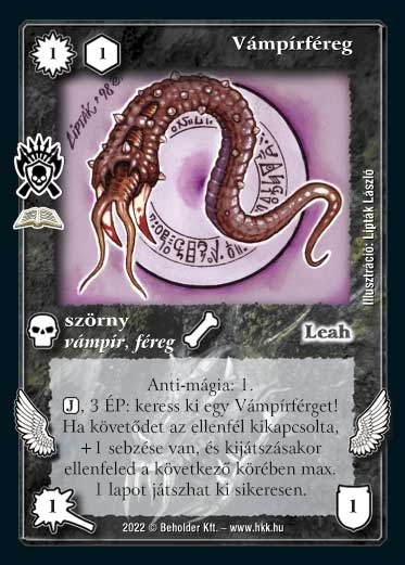 Szöveg: Anti-mágia: 1. (J), 3 ÉP: keress ki egy Vámpírférget! Ha követődet az ellenfél kikapcsolta, +1 sebzése van, és kijátszásakor ellenfeled a következő körében max. 1 lapot játszhat ki sikeresen.