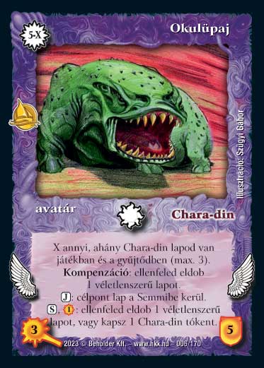 Kiadás: Hódítások Gyakoriság: ritka Lapszín (isten): Chara-din Típus: avatár Szöveg: X annyi, ahány Chara-din lapod van játékban és a gyűjtődben (max. 3). Kompenzáció: ellenfeled eldob 1 véletlenszerű lapot. (J): célpont lap a Semmibe kerül. (S), (1): ellenfeled eldob 1 véletlenszerű lapot vagy kapsz 1 Chara-din tókent. Illusztráció: