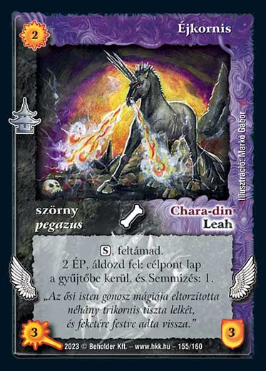 Kiadás: Császárváros Gyakoriság: nem gyakori Lapszín (isten): Leah-Chara-din Típus: szörny Altípus: pegazus Szöveg: (S), feltámad. 2 ÉP, áldozd fel: célpont lap a gyűjtőbe kerül, és Semmizés: 1. Szinesítő szöveg: "Az ősi isten gonosz mágiája eltorzította néhány trikornis tiszta lelkét, és feketére festve adta vissza." Illusztráció: Markó Gábor