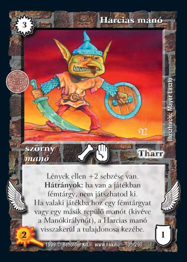 Szöveg: Repül. Ha van a játékban fémtárgy, nem játszhatod ki. Ha valaki játékba hoz egy fémtárgyat vagy egy másik repülő manót (kivéve a Manókirálynőt), a Harcias manó visszakerül a tulajdonosa kezébe. Lények ellen +2 sebzése van.