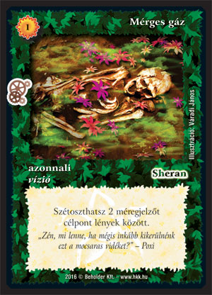 Kiadás: Kreátor műhelye Gyakoriság: gyakori Lapszín (isten): Sheran Típus: azonnali Altípus: vízió Szöveg: Szétoszthatsz 2 méregjelzőt célpont lények között. Szinesítő szöveg: "Zén, mi lenne, ha mégis inkább kikerülnénk ezt a mocsaras vidéket?" - Poxi Illusztráció: Váradi János