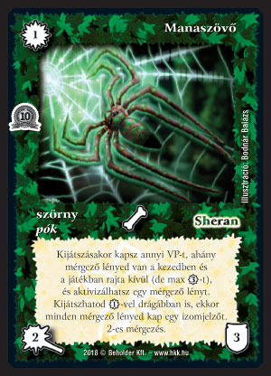 Szöveg: Kijátszásakor kapsz annyi VP-t, ahány mérgező lényed van a kezedben és a játékban rajta kívül (de max 3_VP-t), és aktivizálhatsz egy mérgező lényt. Kijátszhatod 1_VP-vel drágábban is, ekkor minden mérgező lényed kap egy izomjelzőt. 2-es mérgezés.